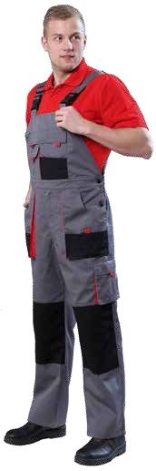 Застежки по бокам на пуговицы. Многочисленные объемные карманы. Усилительные накладки в области коленей. Цвет: основной – серый, отделка – черная, красная;