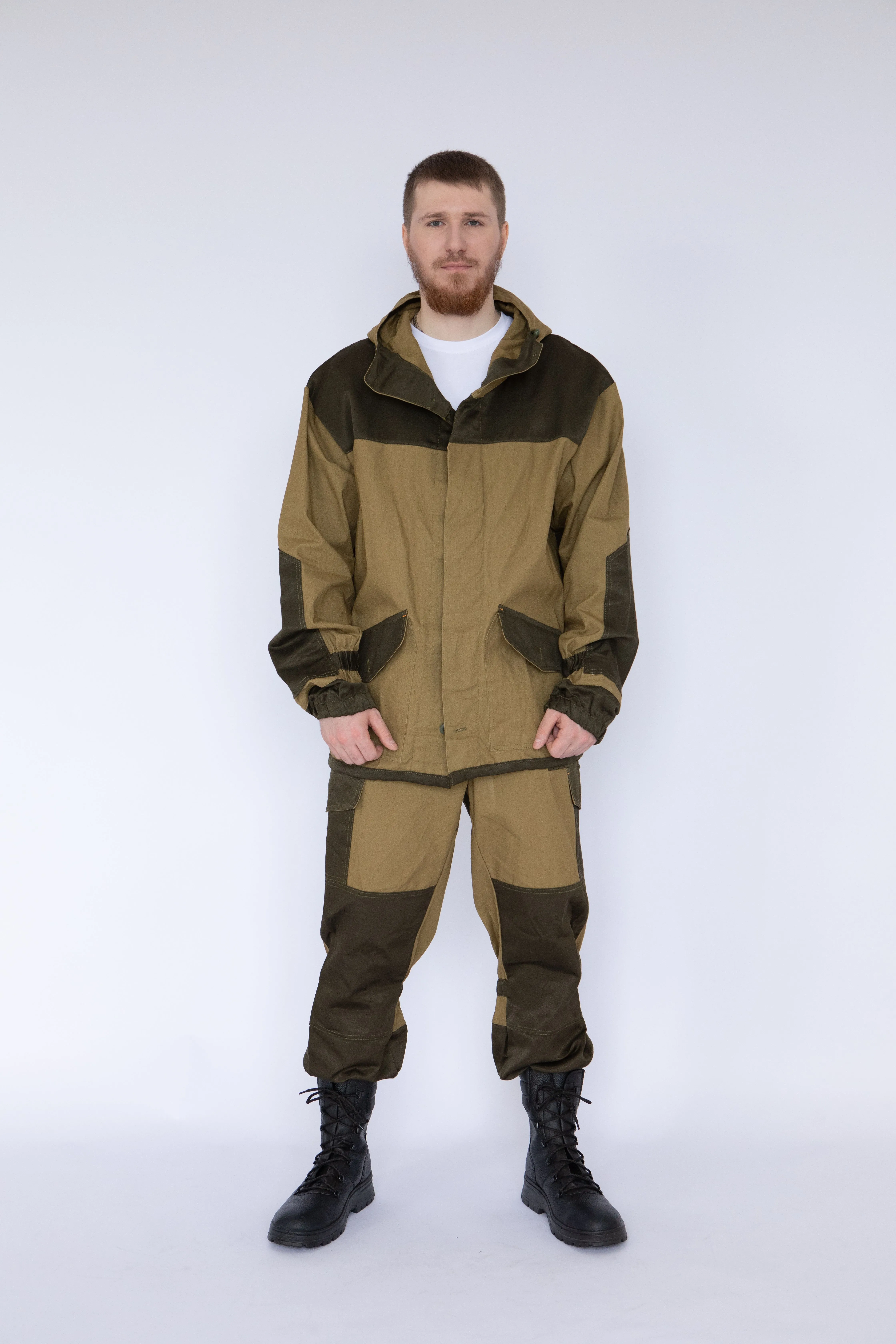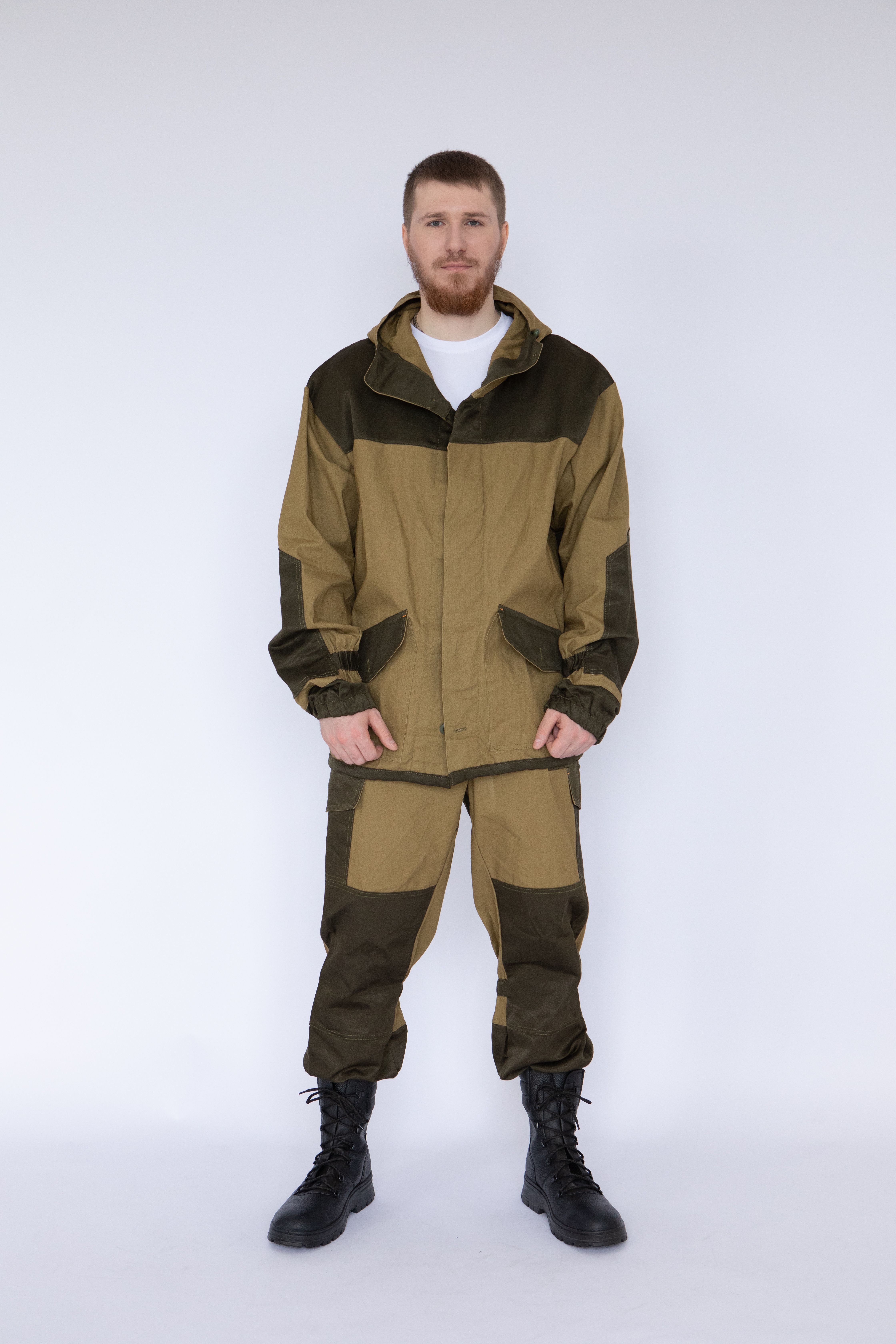 ➠ Брюки с цельнокроеным поясом, застегиваются на петлю и пуговицу. На верхних частях передних половинок расположены верхние накладные карманы и нижние накладные карманы с фигурными клапанами на пуговицах. Нижние карманы с объемом с одной стороны и переходят на задние половинки.