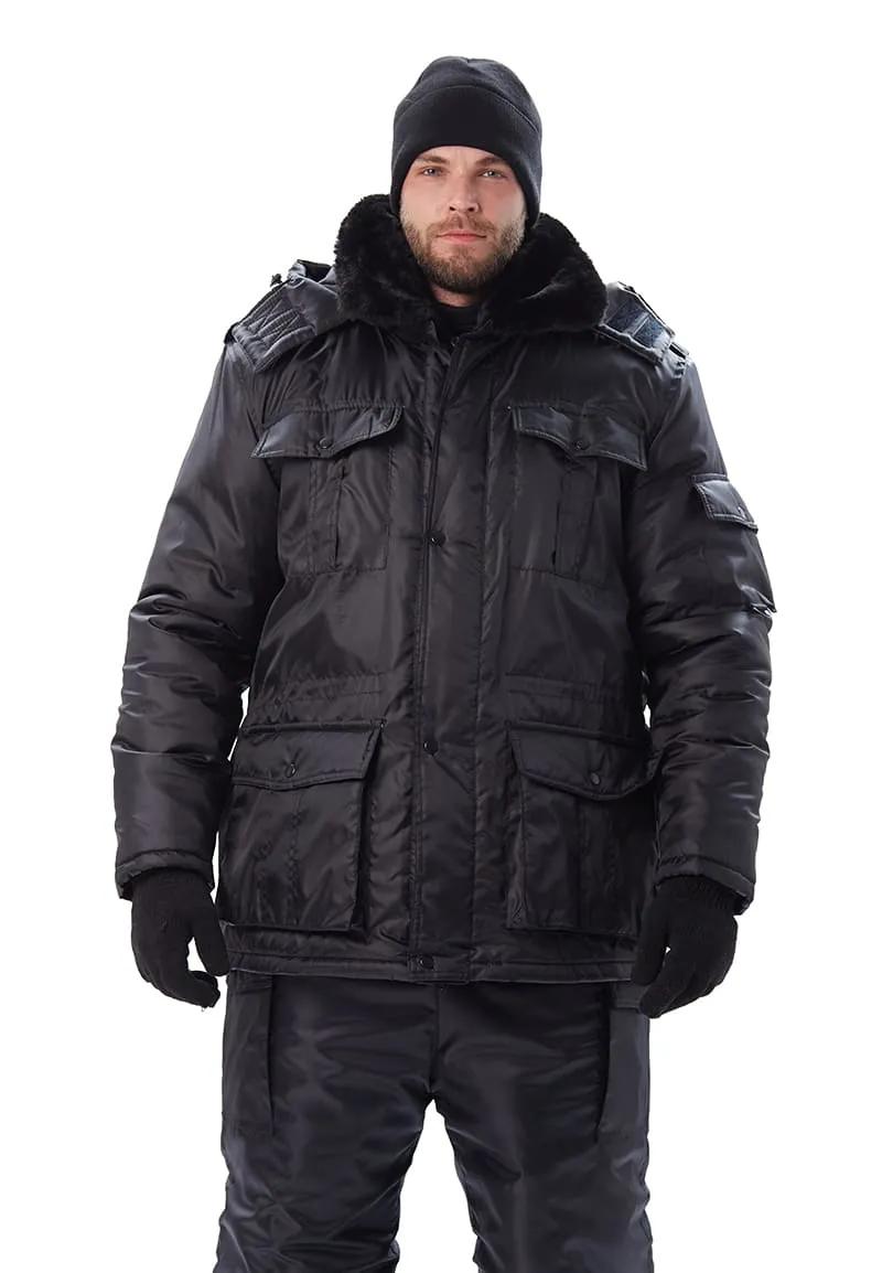 Куртка с застежкой на молнию и кнопки, меховым воротником, утепленным капюшоном. На куртке накладные объемные карманы, внутренний карман для документов, погоны на кнопках. Нижние карманы утеплены. Объем куртки регулируется по линии талии.