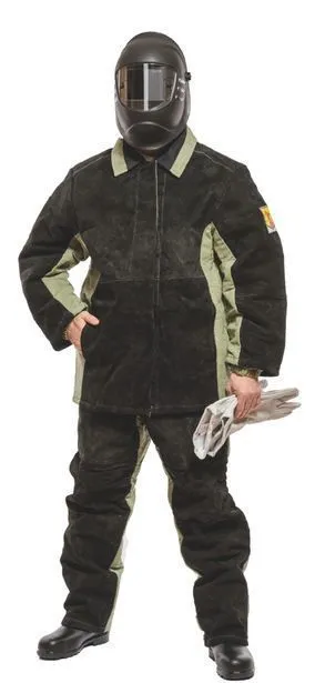 Брюки с боковыми застежками на пуговицах, с карманами в боковых швах. Защитные спилковые накладки расположены на полочках, передней части рукавов и передних половинках брюк. Костюм обеспечивает защиту от искр и брызг расплавленного металла.