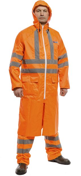 Плащ с застежкой на молнии, клапаном против ветра, капюшоном, двумя карманами с клапанами. Проклеенные швы.