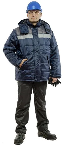 С центральной застежкой на молнию, с ветрозащитной планкой на контактной ленте. Кокетки спинки и полочек выполнены из отделочной ткани контрасного цвета. Под кокетками лента СВП 5 см. Пристегивающийся капюшон, воротник-стойка. На куртке прорезные карманы на молнии с клапанами.