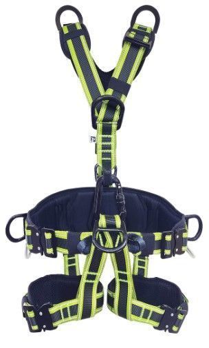 Привязь состоит из наплечных и набедренных лямок разного цвета – для удобства надевания и широкого поясничного пояса. Пояс и лямки на плечах и бедрах, оснащены мягким тканевым компенсатором для комфортной работы в течение всего дня. Лямки соединяются в области груди.