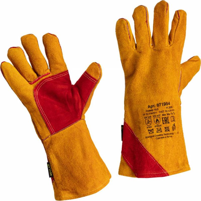 Краги из высококачественного желтого спилка (толщина 1,1-1,2 мм), пятипалые.